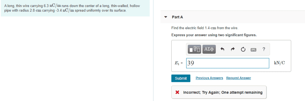 I am assuming you treat the wire as a continuous electric field, and then also treat the pipe as a continuous electric field. I solved for this using superposition, but it was incorrect, so then I tried multiplying it by 2πr (circumference) and it was incorrect as well. Maybe I input the wrong values? Any help is appreciated. Thank you.