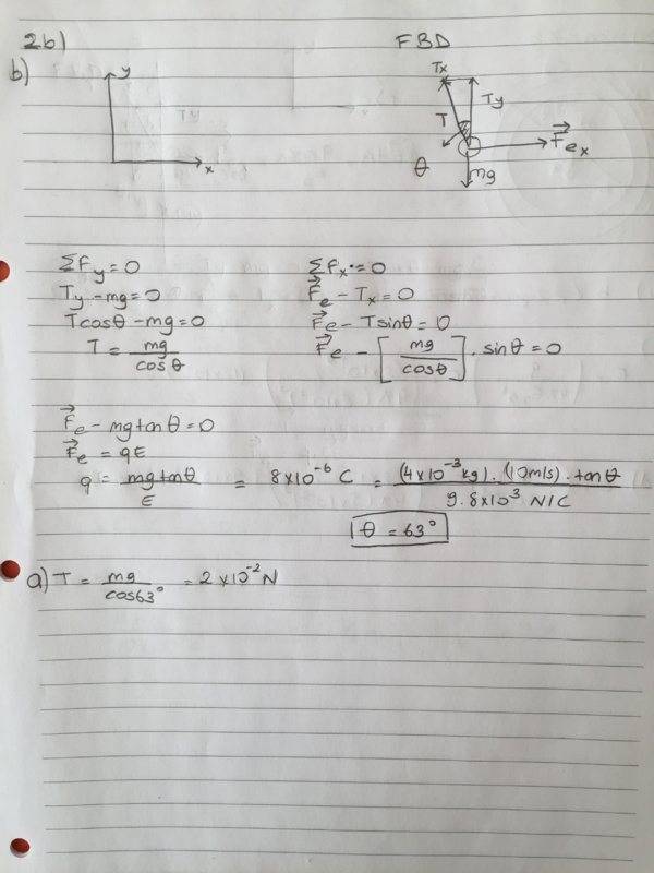 The discussion revolves around a problem involving the forces acting on a small plastic ball suspended in an electric field. The ball has a specified mass and charge, and the problem requires determining the tension in the string and the angle of the string with respect to the vertical.