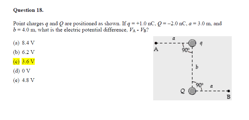 The discussion centers on calculating the electric potential difference between two points, A and B, due to two point charges: q = +1.0 nC and Q = -2.0 nC. The correct approach involves computing the potential at each point from both charges using the formula V = ke(q/r). The calculated potentials at points A and B must account for contributions from both charges to determine the potential difference, Va - Vb, which ultimately resolves to 3.6V. Misunderstandings arose from focusing on individual charge contributions rather than the combined effect at each point.