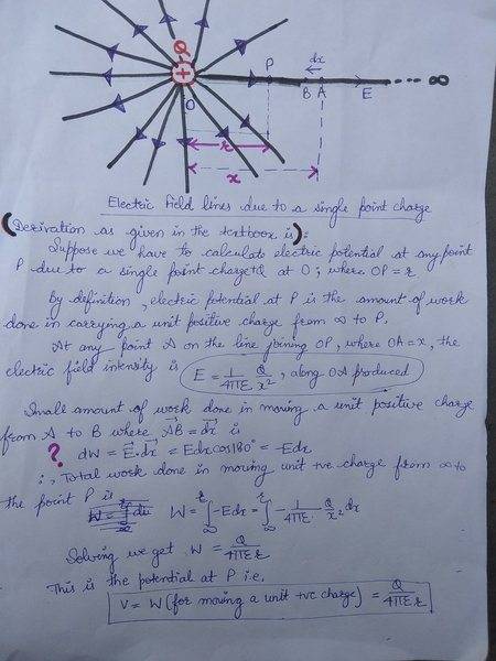The discussion revolves around the calculation of electric potential due to a single point charge, specifically addressing the derivation of work done (dW) in moving a unit positive charge in an electric field. Participants explore the relationship between external force, electric field, and the direction of work done, while questioning the definitions and assumptions presented in a textbook.