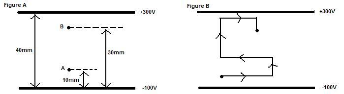 Two plates are 40mm apart and are charged to the potentials of +300V and -100V with respect to Earth as shown in Figure A (see attachment)