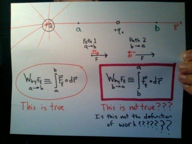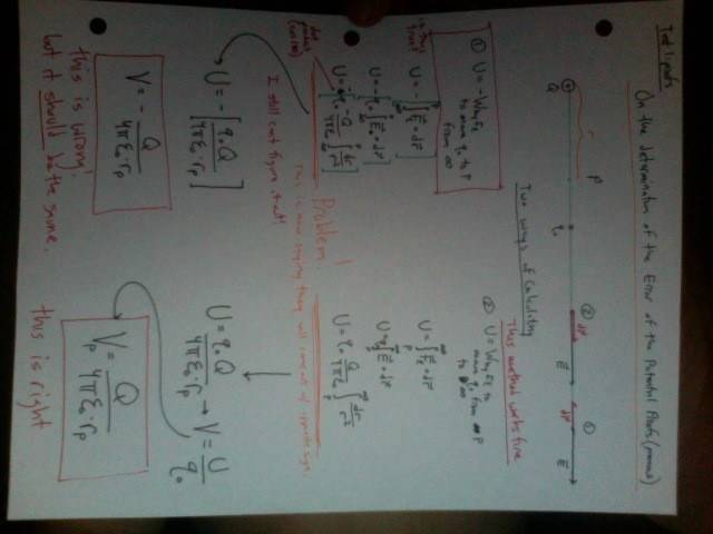 I am having trouble in proving the equation of the electric potential near a point charge Q. There are two different ways I can think to go about deriving the equation V=q/(4*Pi*E0*r). The first way is to calculate the change in potential energy of a test charge q0 in coming from infinite distance to a point P near the point charge Q, considering U=0 at infinity as a reference point. Then setting the change in potential energy equal to the negative of the work done by the electric field. The second way seems to me to be exactly the same mathematically. I am considering the change in potential energy in moving a test charge charge q0 from the point P to infinity. Again the change in potential energy should be equal to the opposite of the work done by the electric field along the path. Setting U=0 at infinity as a reference point, I find that the potential energy at P near the point charge Q is equal to the work done by the electric field along the path to infinity. Using the second method, I arrive at the right equation. But using the first method, I find a negative sign in the equation and I cannot get rid of it. I hope that somebody may be able to tell me what I have done wrong, or if there is something that I am not understanding correctly. I have attached a picture of my work on paper. I hope I have done a good job explaining the problem and that the picture is of decent enough quality.