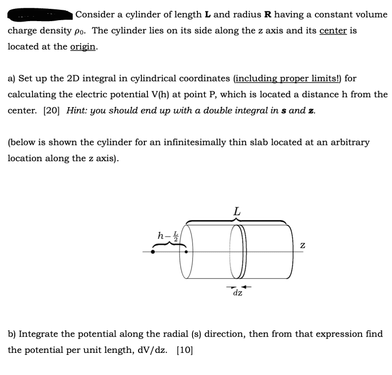 The discussion centers on calculating the electric potential of a point outside a charged cylinder, specifically addressing the correct definition of the separation vector in cylindrical coordinates. Participants emphasize the importance of clearly defining the geometry of the charge density, noting that the absence of symmetry complicates the problem. The correct distance formula for the separation vector is established as $$|\vec{r}-\vec{r'}|=\sqrt{(h-z)^2+s^2}$$, derived using the Pythagorean theorem. The conversation highlights the need for precise definitions and clarity in problem statements to facilitate effective problem-solving.