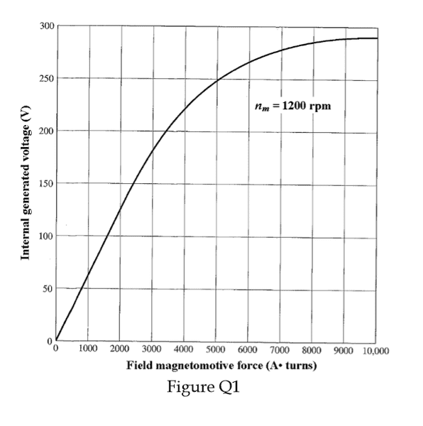 An 8.25 kW shunt DC motor is supplied with a terminal DC voltage of 300 V. The armature resistance of the motor Ra is 0.25 , and the field resistance Rf is 40 . The field winding consists of 1500 turns. An adjustable resistance Radj is connected in series to the field winding. Radj may be varied over the range from 0 to 80 and is currently set at 20 . Armature reaction may be ignored in this machine. The magnetization curve for this motor, taken at a speed of 1200 rpm, is shown in Figure Q1.