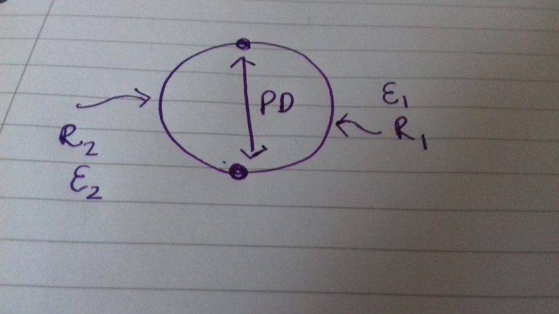 - There is a suggestion that the potential difference could be equal to E1 or E2 depending on the direction of current flow through the loops.