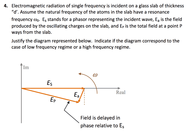 The discussion focuses on the electromagnetic radiation of a single frequency incident on a slab, particularly addressing the challenges associated with phasor analysis in low-frequency scenarios. Key concepts include Huygens' principle, the relationship between the index of refraction (n) and the dielectric properties of materials, and the behavior of electromagnetic waves in plasmas. The index of refraction is defined as n = √(ε_r), where ε_r = 1 + χ, and the phase velocity can exceed the speed of light (c) in certain conditions. The discussion references the MIT OpenCourseWare lecture notes for further insights into plasma physics and dielectric behavior.