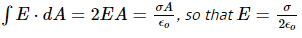So, the solution to part A) is:Charles Link said:A layer of surface charge where you have air on both sides when you draw what is called a Gaussian pillbox around a section of area ## A ## of surface charge density ## \sigma ##. When you calculate the flux on the "inside", the conductor necessarily has ## E=0 ## inside the conductor, so there is no contribution to the flux from the inside surface. Alternatively, if there is air on both sides, both sides get the same outward pointing ## E ## and the result is ## E=\frac{\sigma}{2 \epsilon_o} ##. ## \\ ## (In full detail, for the conductor case: ## \int E \cdot dA=EA=\frac{\sigma A}{\epsilon_o} ##, so that ## E=\frac{\sigma}{\epsilon_o} ##. ## \\ ## And for the case with air on both sides: ## \int E \cdot dA=2 E A=\frac{\sigma A}{\epsilon_o } ##, so that ## E=\frac{\sigma}{2 \epsilon_o} ## ).