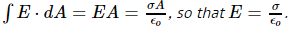 Oh, damn. I finally understood it! Thank you so much! It actually makes sense!Charles Link said:A layer of surface charge where you have air on both sides when you draw what is called a Gaussian pillbox around a section of area ## A ## of surface charge density ## \sigma ##. When you calculate the flux on the "inside", the conductor necessarily has ## E=0 ## inside the conductor, so there is no contribution to the flux from the inside surface. Alternatively, if there is air on both sides, both sides get the same outward pointing ## E ## and the result is ## E=\frac{\sigma}{2 \epsilon_o} ##. ## \\ ## (In full detail, for the conductor case: ## \int E \cdot dA=EA=\frac{\sigma A}{\epsilon_o} ##, so that ## E=\frac{\sigma}{\epsilon_o} ##. ## \\ ## And for the case with air on both sides: ## \int E \cdot dA=2 E A=\frac{\sigma A}{\epsilon_o } ##, so that ## E=\frac{\sigma}{2 \epsilon_o} ## ).