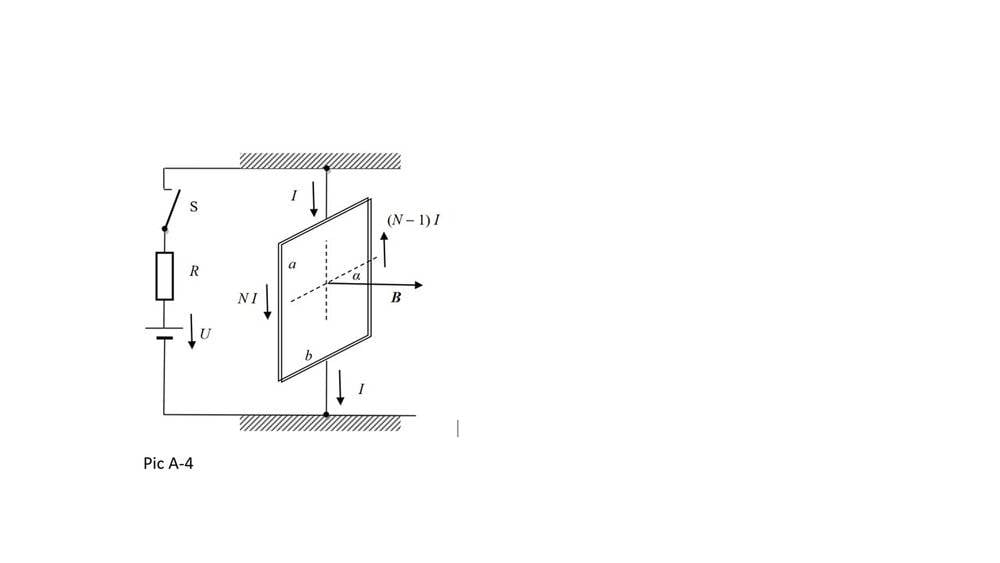 A rectangular coil with a height a, width b, of copper wire with a diameter of d with a number of N-½ threads (or turns or loops, not sure which is the proper word) (the last thread/loop is only half) is mounted on the vertical conductive and elastic fiber (Pic. A − 4).