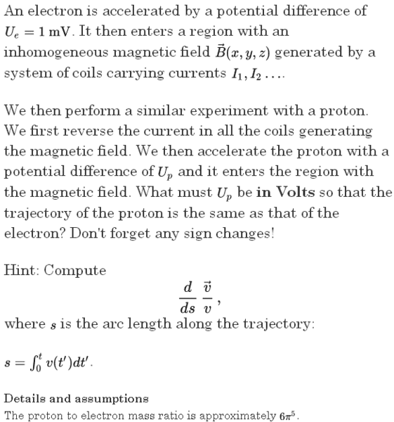 As per the question, the proton follows the same trajectory, hence, ##\vec{\ddot{s_e}}=\vec{\ddot{s_p}}=\vec{\ddot{s}}##. This implies that ##v_e/m_e=v_p/m_p##. But this gives the wrong answer. Where is the mistake in this approach?