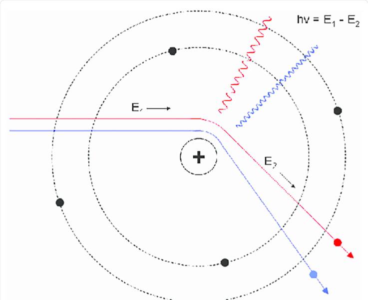 The discussion revolves around the implications of electron scattering off an atomic nucleus, particularly focusing on the relationship between the emitted bremsstrahlung radiation and the electron's acceleration and momentum changes. Participants explore concepts related to the timing of these processes, the nature of photon emission, and the rules governing transitions between quantum states.