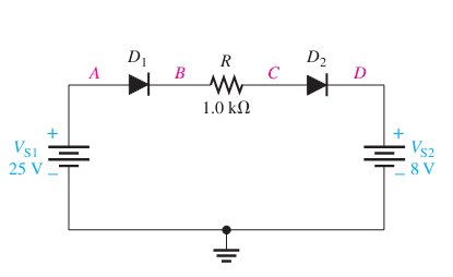 Participants have not fully defined the circuit configuration or the relationships between the points, leading to potential limitations in their calculations. The assumptions about the diode behavior and the voltage sources are also not explicitly stated.