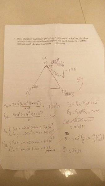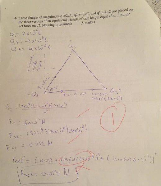 The discussion revolves around a problem related to electrostatic forces acting on the vertices of an equilateral triangle. The original poster expresses confusion regarding the grading of their solution by a Physics teacher, who marked it as incorrect despite the poster believing their final answer was accurate.