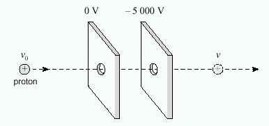 1. A moving proton has 6.4 x 10-16 J of kinetic energy. The proton is accelerated by a potential difference of 5 000 V between parallel plates. The proton emerges from the parallel plates with what speed?
