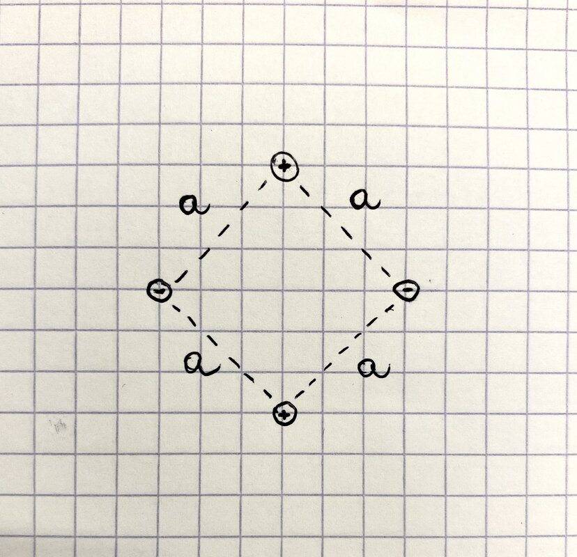 The discussion centers on a physics problem involving four charged particles positioned at the vertices of a square with side length 'a'. Two positively charged particles (+|e|) are stationary due to their large mass, while two negatively charged particles (-|e|) are in motion. The objective is to determine the distance between the negatively charged particles when their velocity reaches its maximum. Key equations related to the forces between charged particles and the relationships between acceleration, velocity, and position are essential for solving this problem.