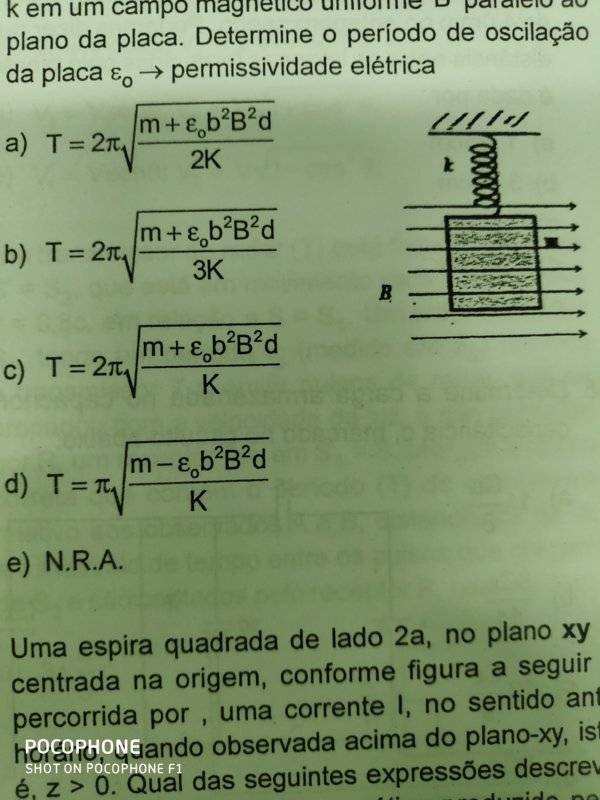 - A plate of cupper with mass m has a square shape with side length b and thickness d. The plate is suspended vertically by a spring with constant k in an uniform magnetic field horizontal and parallel with the plates plane. Find the period of vertical oscillations of the plate