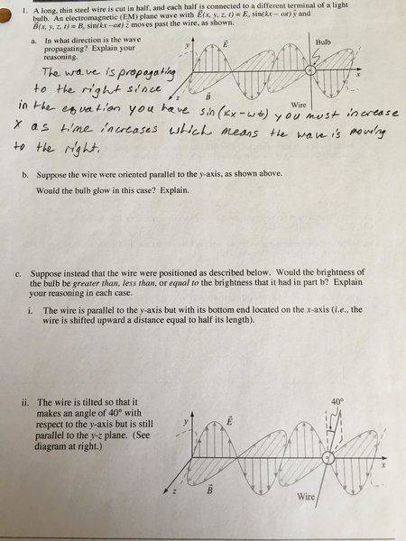 For part c (ii) I said that the wire would be brighter since it is at a 40 degree angle, but I really don't feel confident with this answer as I was basing it on the degrees only.