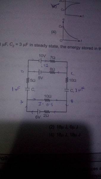 In the circuit shown, C1= 1 microfarad, C2=3 microfarad, in steady state, the energy stored in these capacitors are?