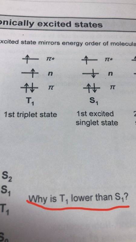 The picture shown below is one triplet state and one singlet excited state of molecular orbitals. According to Hund's Law, the triplet state, which has 2 electrons with parallel spin, has lower energy than the singlet state. I went through some papers, only to be told that the triplet state has lower energy because the electrons in triplet state tend to stay away from each other thus lessen the repulsion between them. However, none of the papers gave a clear explanation of why electrons with parallel spin are likely to stay away from each other while those with opposite spins can move freely, which I am very curious about.