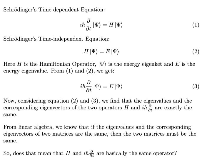 The discussion revolves around the relationship between the energy operator and the Hamiltonian operator in quantum mechanics, specifically addressing whether they are the same. Participants explore concepts related to Schrödinger's Equation, the nature of wavefunctions, and the implications of operator actions in quantum theory.