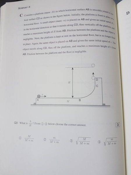 Consider a platform (mass: M) which horizontal surface AB s smoothly joined to vertical surface CD as shown in the figure below. Initially, the platform is fixed in place on a horizontal floor. A small object (mass: m) is placed on AB and given an initial speed of v in the horizontal direction so that it travels along CD, flies vertically off the platform, and reaches a maximum height of H from AB. Friction between the platform and the object is negligible. Next, the platform is kept at rest on the horizontal floor, but is no longer fixed in place. Again, the same object is placed on AB and given the same initial speed of v. The object travels along CD, floes off platform, and reaches a maximum height of from AB. Friction between the platform and the floor is negligible.