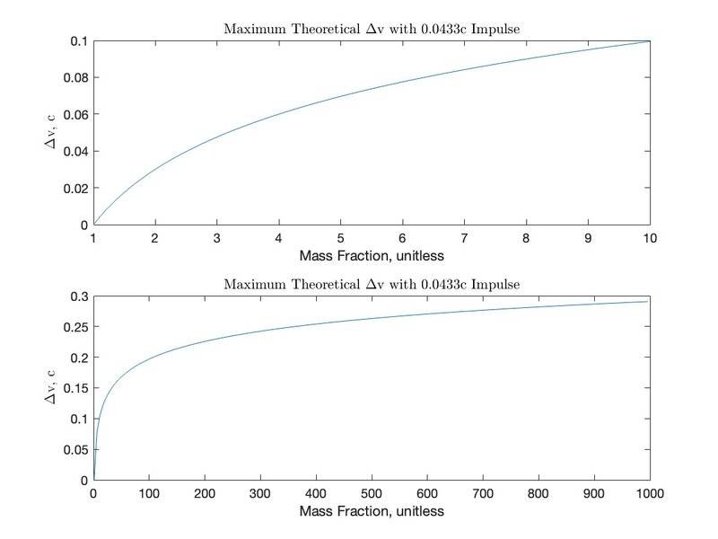 really wanna go fast. Increasing the mass fraction, as show in the figure above, allows for much higher velocity travel with lower exhaust velocity. The downside is