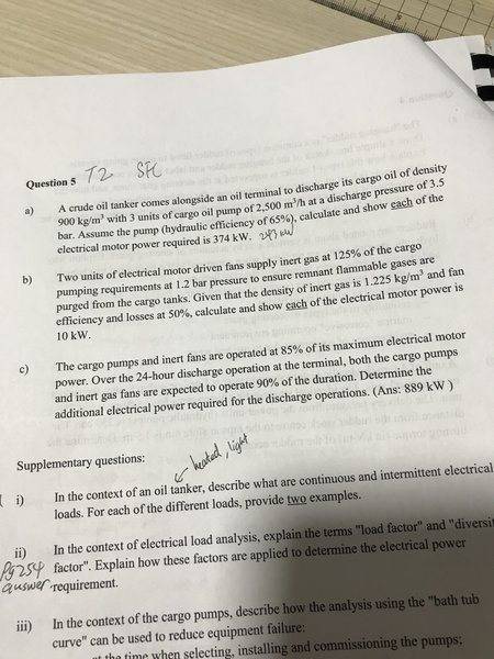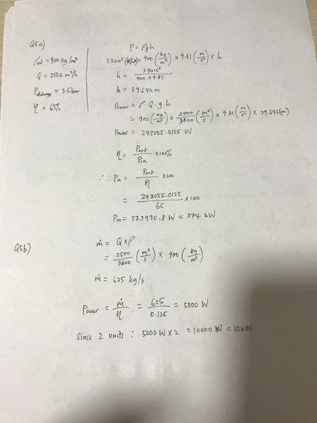 The discussion revolves around calculating the power requirements for an electrical motor in a specific application, particularly focusing on the power needed for fans and pumps. Participants explore different methods to arrive at the power output, including considerations of efficiency and flow rates. The context includes both theoretical calculations and practical implications, with references to specific parts of a question set.