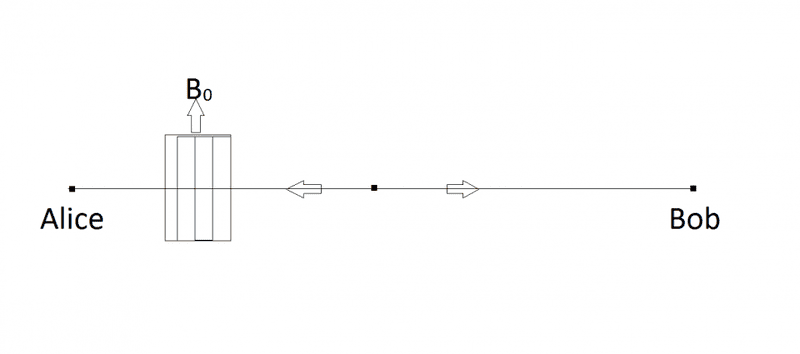 In a setting of two entangled spin-1/2 particles, suppose that Alice applies a uniform magnetic field ##B_0## along ##z## direction at her location. She dose not measure the spin of her particle but because the particle passes through ##B_0## the spin should align along that direction as this is the lowest energy the particle may have. And if she is 100% sure that her unmeasured particle is spin-up, she must conclude that Bob`s particle is spin-down due to conservation of the angular momentum. Now if Bob, however, measures his particle spin and finds that it is spin-down, then he must conclude that Alice uniform magnetic field is directed up and vice versa. Then based on the outcome of his result, he knows the direction of Alice`s ##B_0## which means that Alice can encode any message in the form of 1 and 0 where 1 means ##B_0## is toward the +ve Z-direction and 0 means that ##B_0## is along the -ve Z-direction and this message can be delivered faster than light.