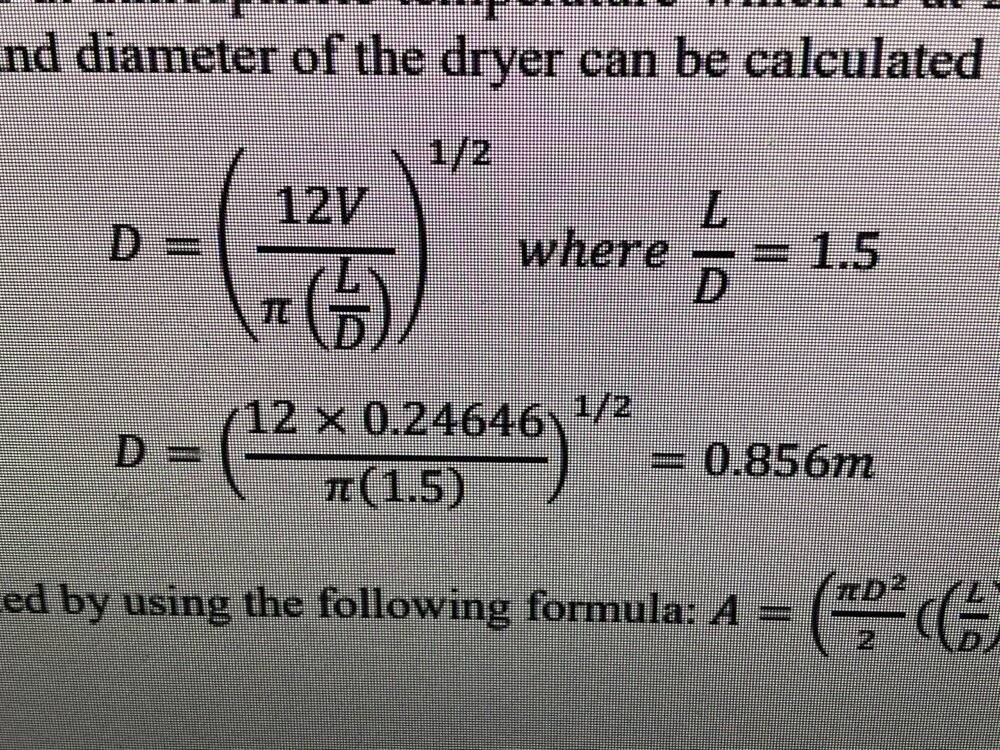 The discussion revolves around an equation for calculating the diameter of a dryer based on its volume and length/diameter ratio. Participants are exploring its validity, derivation, and dimensional consistency.