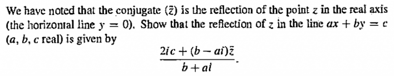 I have attached a problem I was working on (and have the solution), but am curious as to why the definition of a line is given by ##ax + by = c##. Are not ##x## and ##y## also variables that take on strictly real values? Should not this equation for this function (upon which an arbitrary point ##z^* = x^* + iy^*## will be reflected) be written: ## y = -i(\frac {a}{b})x + \frac {c}{b} ## since we are discussing the ##z##-plane where the imaginary axis corresponds to the value of ##y##?