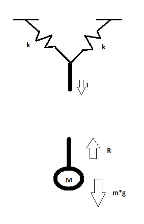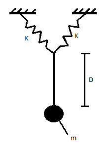 System consists of two springs located under 45 degrees to the vertical (both have same k-value) in undisturbed situation. Lower ends of the springs are attached to each other and to massless rod with length D, upper ends to immovable supports. The massless rod has point mass (m) at the lower end. System can move vertically and horizontally and is exposed to gravity.