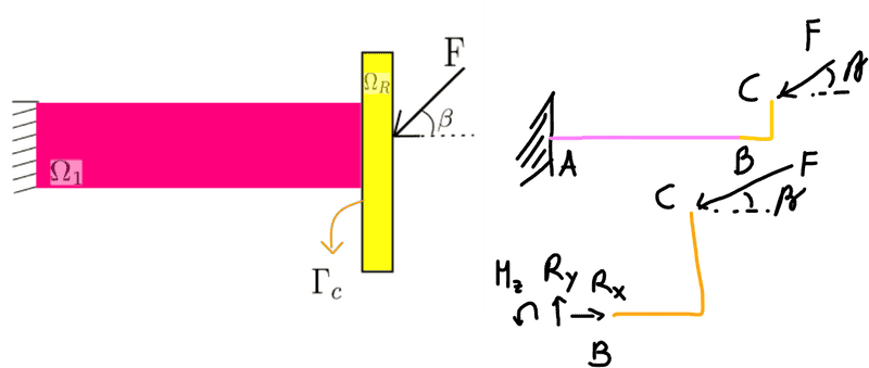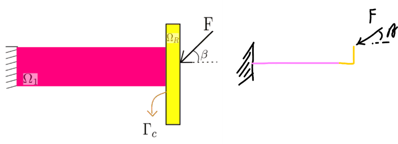 Consider a structure comprising an elastic deformable body (in pink) attached to a rigid body (in yellow) at the right side ( $\Gamma_c$ interface) and fixed at the left side.