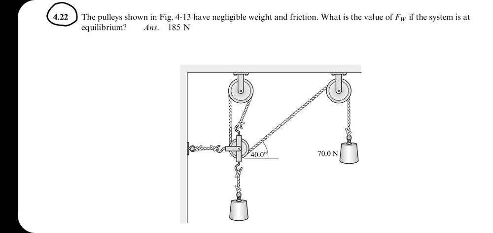 The discussion centers on calculating the force ##F_w## in a system involving three pulleys and two weights, specifically identifying the answer as 185N. The key to solving this problem lies in determining the tension of the rope supporting the 70N weight, which is essential for analyzing the forces at play in the "weird pulley." Participants emphasize the importance of breaking down the forces into their x and y components, particularly focusing on the y components to apply Newton's 2nd law effectively.