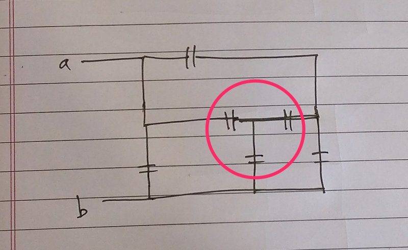 The discussion revolves around a circuit analysis problem involving equivalent capacitance and Kirchhoff's laws, specifically in the context of a Wheatstone bridge configuration.
