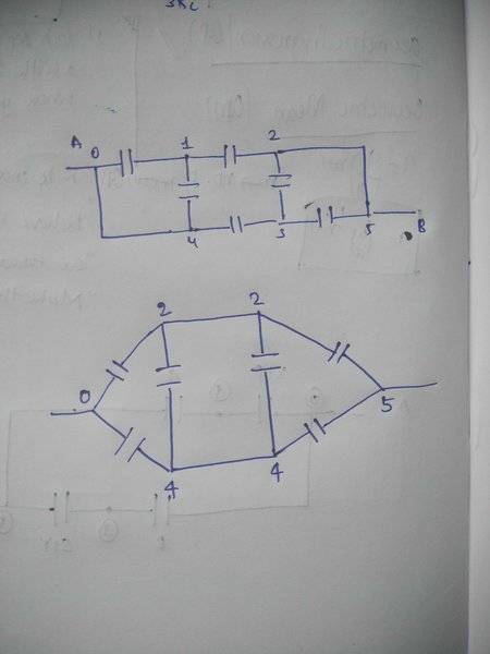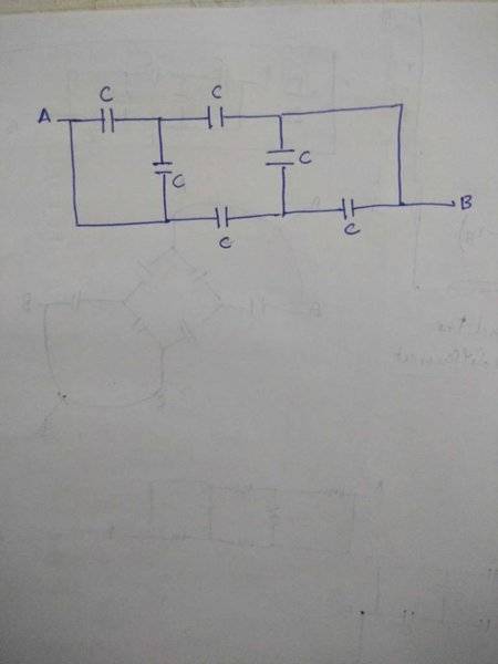 The discussion revolves around finding the equivalent capacitance between two points, A and B, in a circuit containing multiple identical capacitors. Participants explore various methods and approaches to solve this problem, including circuit simplification techniques and the application of Kirchhoff's laws.
