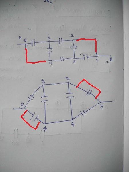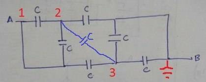 The discussion revolves around finding the equivalent capacitance between two points, A and B, in a circuit containing multiple identical capacitors. Participants explore various methods and approaches to solve this problem, including circuit simplification techniques and the application of Kirchhoff's laws.