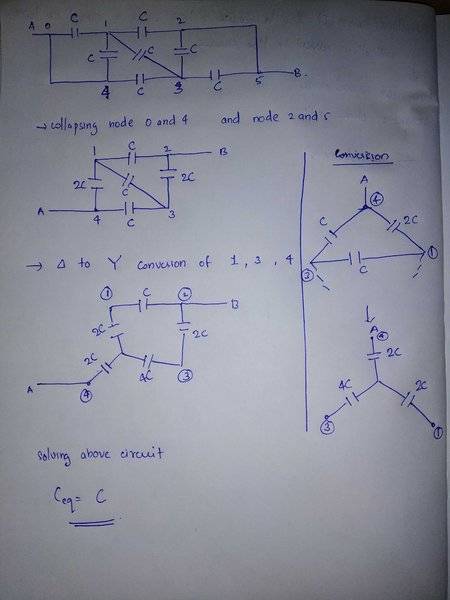 - Participants discuss the implications of collapsing nodes in the circuit and how it affects the connections between capacitors.