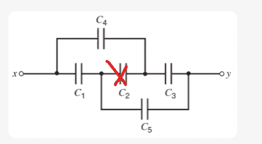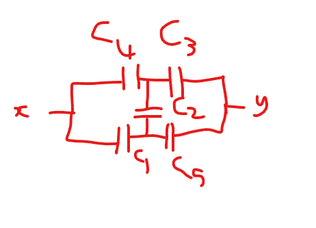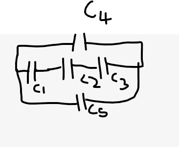 The discussion focuses on understanding the equivalent capacitance of a circuit involving capacitors C1, C2, C3, C4, and C5. Participants clarify that capacitors C1 and C2 are in series, leading to an equivalent capacitor C12, while C12 and C4 are in parallel, resulting in C124. Additionally, C3 and C5 are in parallel, forming C35, and the final equivalent capacitor C12345 is derived from the series combination of C124 and C35. The symmetry argument is emphasized, particularly the condition that the voltage difference across capacitor C2 (∆V2) is zero due to the equal potential on both sides.
