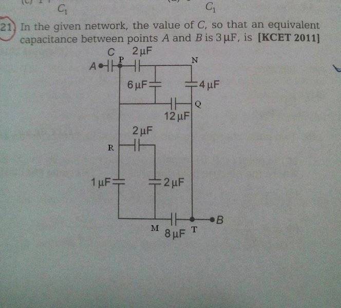 First I calculated equivalent capacitance between R and M . The two 2μF capacitors are in series . Their combination is in parallel with the 1μF capacitor . Their equivalent capacitance is 2μF .