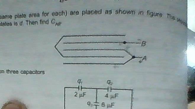 Five plates with same area are placed as in figure. Distance between any 2 consecutive plates is d. Find equivalent capacitance(ab). (Note-Answer is given as 5C/3, in terms of C so I suppose C is capacitance of a +ve and -ve plate separated by d). The lower letter is A, it is marked positive and upper letter is B marked negative.