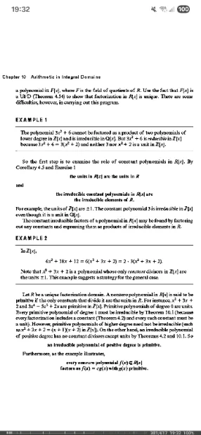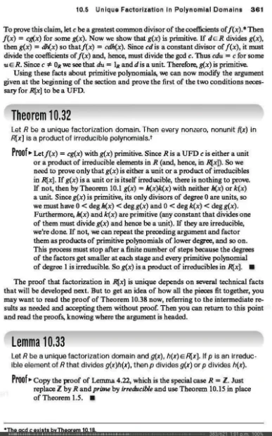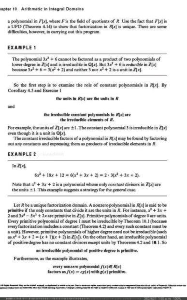 ##\textbf{Definition 2:}## Let ##R## be an UFD. Hence highest common factors of finite subsets of ##R## exists, by collecting common factors of the unique factorization of the elements into products of irreducibles.A polynomial ##f(x)\in R[x]## is called ##\textbf{primitive}## if the highest common factors of the non-zero coefficients of ##f(x)## is equal to ##1##. This implies that if ##u\in R## and ##u|f(x)## then ##u## is a unit in ##R.##