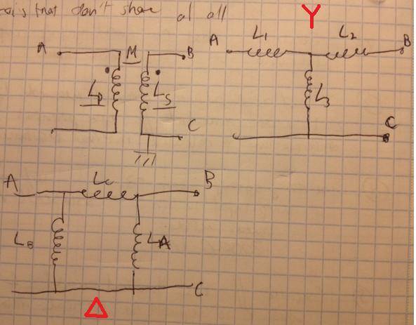 The discussion revolves around a circuit consisting of two ideal inductors, L_{S} and L_{P}, which are magnetically coupled with mutual inductance, M. Participants explore the possibility of replacing these inductors with three coils that do not share magnetic flux linkages, focusing on the “Y” and “Δ” configurations. The goal is to calculate various inductance values, including L_{1}, L_{2}, L_{3}, L_{A}, L_{B}, and L_{C}.