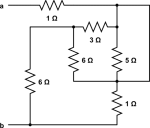 For example, I feel the next step is to combine the 6 ohm and the 5 ohm resistor in the middle. But I can't say they are in parallel, with the 3 ohm and the 6 ohm being in series, as the other 6 ohm resistor is there tacked on. So the 3 ohm resistor is in parallel with the two 6 ohm ones. But again, I can't use the parallel equal for those because the right 6 ohm resistor is connected to the 1 ohm resistor, and I can't say the 6 ohm and the 1 ohm are in series, because the 5 ohm and the top 1 ohm are also connected to it. And I can't say the top 1 ohm, the 3+6+6 ohm portion, and the 5 ohm portion are all in parallel, because the 1 ohm connects at the top and at the bottom.