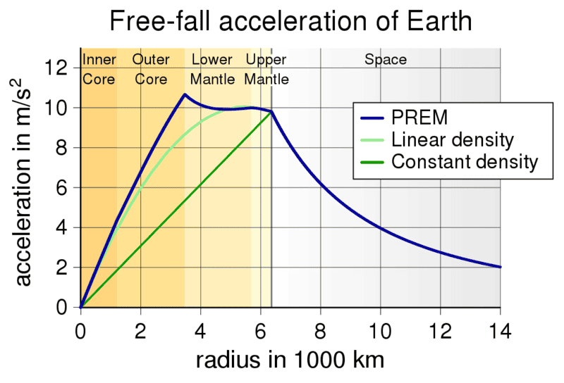Just to note that the gravitational potential at the center is the area under the curve here. The difference between PREM and constant density is appreciable. The area outside of the Earth radius is easy to underestimate, but it is the same for all models obviously.PeroK said:Take a look at the variation in gravitational acceleration inside the Earth here: