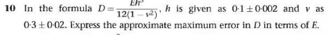 - 1. In the formula D = Eh^3/(12(1-v^2)), h is given as 0,1 +- 0,002 and v as 0,3 +- 0,02. Express the approximate maximum error in D in terms of E.