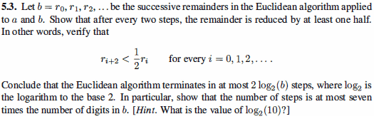 - Participants discuss showing that the remainder at step i+2 is less than half of the remainder at step i. There are attempts to establish inequalities involving the remainders and their relationship to the initial value b. Questions arise about how to apply logarithmic properties to demonstrate the termination condition.