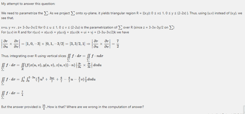 The discussion revolves around evaluating a surface integral of the form ##\iint\limits_{\Sigma} f \cdot d\sigma##, where the function and its components are under scrutiny. The problem involves understanding the correct formulation of the vector field and the surface element.