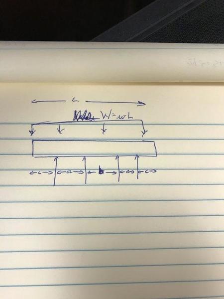 The discussion revolves around the analysis of an evenly distributed load on a beam with multiple supports and overhangs. Participants explore methods to express reaction loads as functions of support distances, particularly in the context of ensuring structural integrity under specific loading conditions.