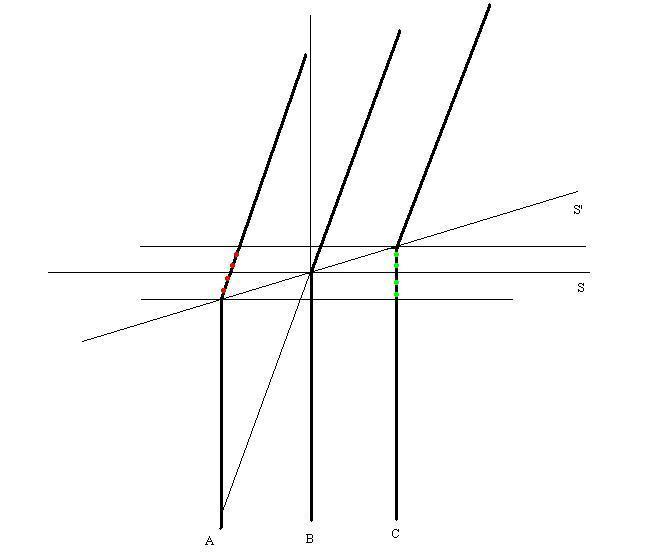First off, let me point out that your scenario has nothing to do with the fact that A, B and C are clocks--they could just as easily be rocks. You haven't asked about the times on the clocks.