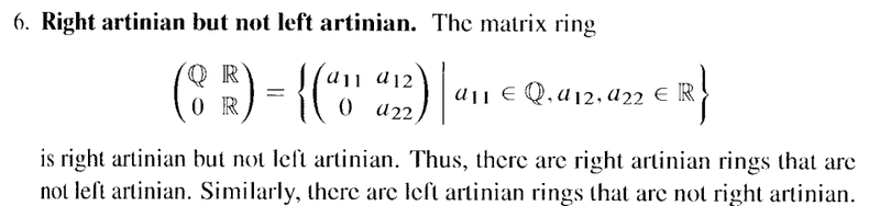 is right Artinian but not left Artinian ...Can someone please help me to prove this assertion ...My thoughts on how to do this are limited ... but include reasoning from the fact that the entries in the matrix ring are all fields and thus the only ideals are ##\{ 0 \}## and the whole ring(field) ... and so the chains of such ideals should terminate ... but this seems to imply that the matrix ring is both left and right Artinian ...